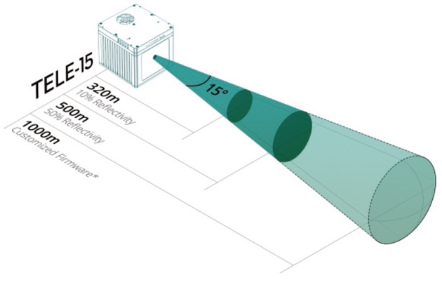 泰覽 Tele-15 作為主激光雷達(dá),負(fù)責(zé)超遠(yuǎn)距離的探測(cè);根據(jù)不同場(chǎng)景,也可輔助使用 Avia 或 HAP 激光雷達(dá)進(jìn)行水平方向覆蓋。Tele-15 具有量程超遠(yuǎn)、點(diǎn)云密度超高的特性,10%反射率即可測(cè)距320m,遠(yuǎn)可探測(cè)500m外物體;超高點(diǎn)云密度對(duì)于小物體探測(cè)具有天然的優(yōu)勢(shì),行人在300m處依舊可以探測(cè)到12個(gè)點(diǎn)(100ms時(shí)間內(nèi));