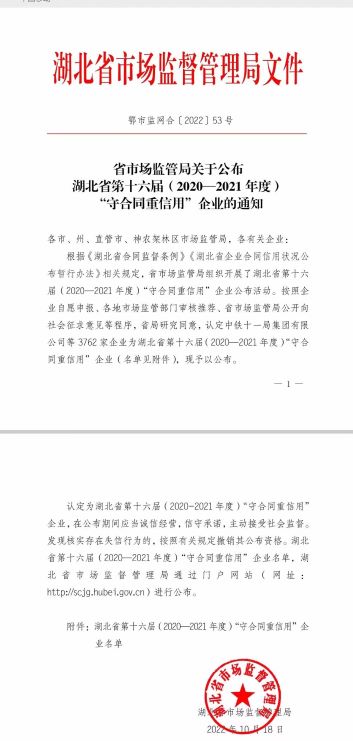 根據(jù)《湖北省合同監(jiān)管條例》《湖北省企業(yè)合同信用狀況公布暫行辦法》相關(guān)規(guī)定,省市場監(jiān)督局組織開展湖北省第十六屆(2020-2021年度)“守合同重信用”企業(yè)公布活動(dòng),按照企業(yè)自愿申報(bào),各地市場監(jiān)管部門推薦,省市場監(jiān)督局公開向市場征求意見等程序,我司被認(rèn)定為湖北省第十六屆“守合同重信用”企業(yè)稱號(hào)!