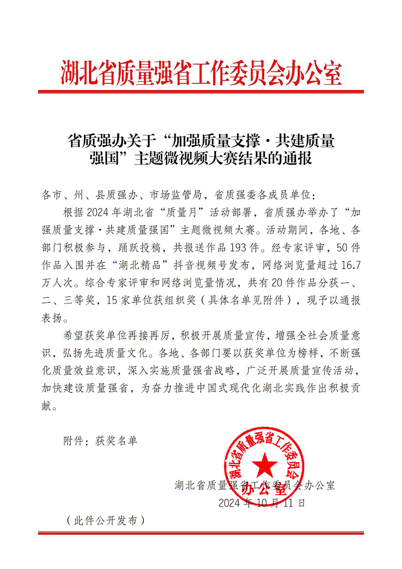 湖北艾克在省質(zhì)強辦舉辦的“加強質(zhì)量支撐、共建質(zhì)量強國”主題微視頻大賽中,獲評全省二等獎!
